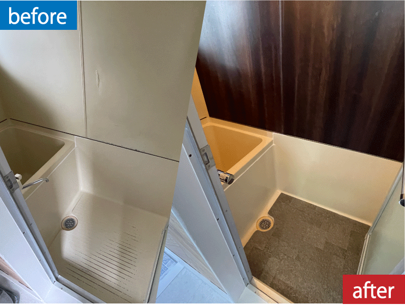 市川市のアパートの浴室をリフォームしました。壁にパテ埋めの跡が残り気になっていましたが、ダイノックフィルムで綺麗な木目調へ様変わりしました。
